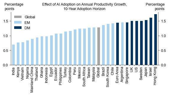 - The gray lines for each country represent the estimated effect of AI adoption on that specific country’s productivity growth. The effects for individual countries vary considerably, ranging from a low of 0.5 percentage points to a high of 1.5 percentage points.