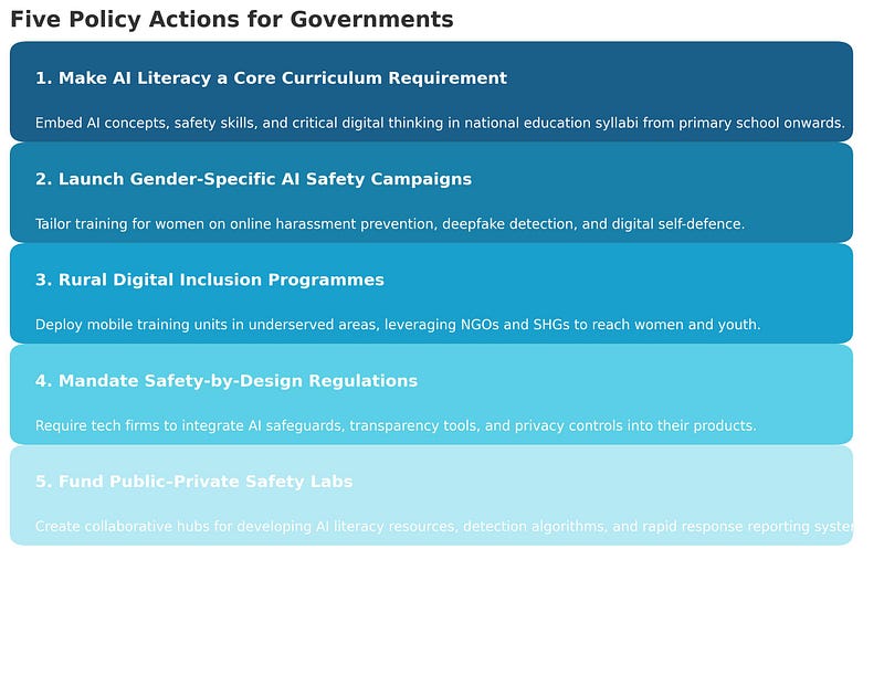 - Establish public-private safety labs to develop AI literacy campaigns, detection tools, and rapid-response reporting channels.