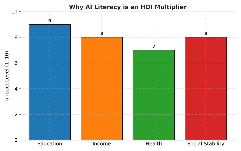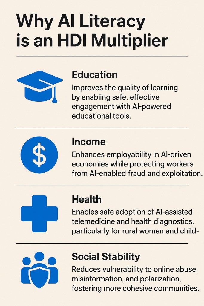 By reducing vulnerability and improving participation in digital economies, AI literacy indirectly supports HDI growth. Education levels rise when students can engage safely online; income levels rise when individuals can leverage AI tools without fear of exploitation; life expectancy benefits when digital health technologies are used effectively and safely.